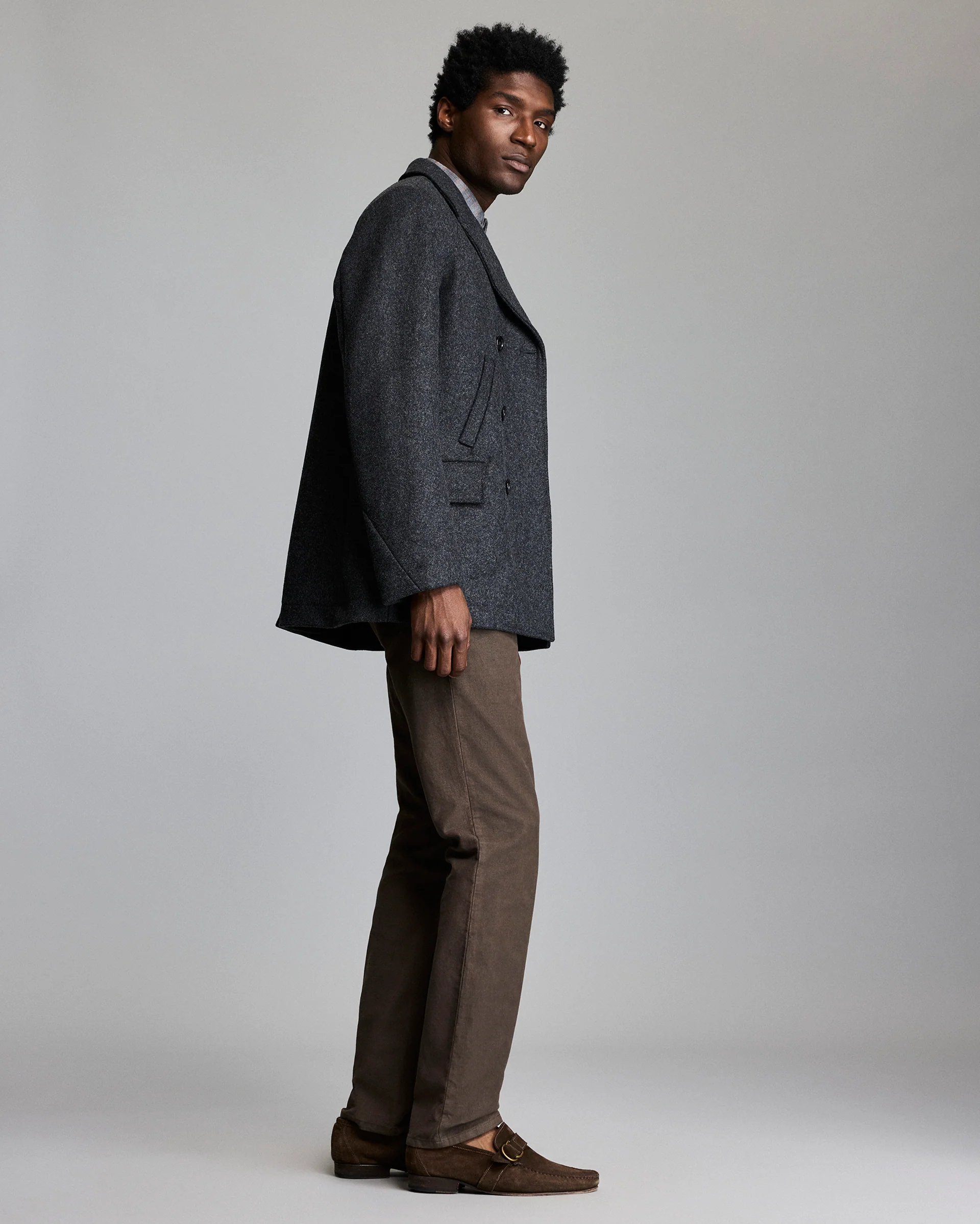 Our first version of the Bond Peacoat dates back two decades. Originally named after our Bond Street store in New York, Daniel Craig famously wore it in the James Bond movie Skyfall. The response to that moment made the peacoat one of our most beloved pieces. Our iconic Bond is made in Italy from warm, sturdy Melton wool and thoughtfully finished with bound seams. This mark of craftsmanship eliminates the need for a liner, reducing bulk and ensuring comfort. The piece is finished with our signature heirloom ribbon stripe embossed on luxe calfskin leather under the collar, handwarmer chest pockets, and genuine horn buttons. It remains an enduring take on a menswear classic.