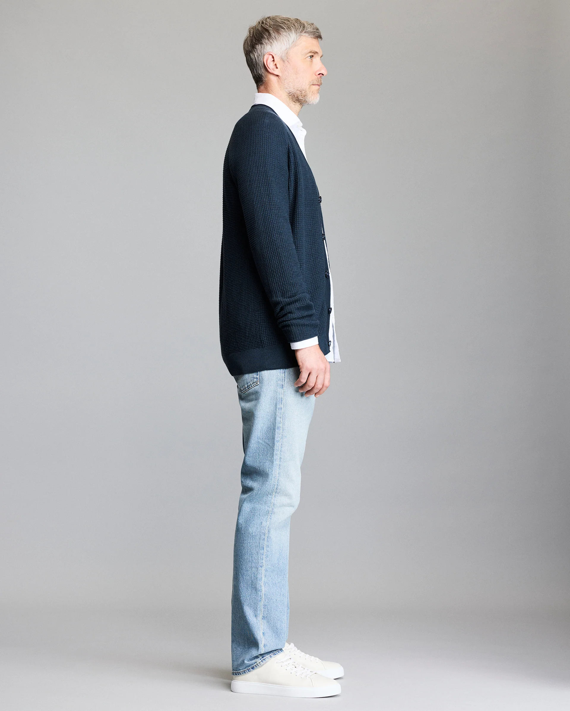 An updated riff on our bestselling cotton-cashmere Mini Waffle Crew, this cardigan is ultra-soft, lightweight and features a reverse waffle weave at the elbows, and raglan sleeves with a jersey roll at the cuffs. It's finished with thoughtful Billy Reid design details, like our signature heirloom ribbon stripe at the back neck, and dark horn buttons at the front. It's a versatile layering piece that can effortlessly be worn over a t-shirt or a button down.