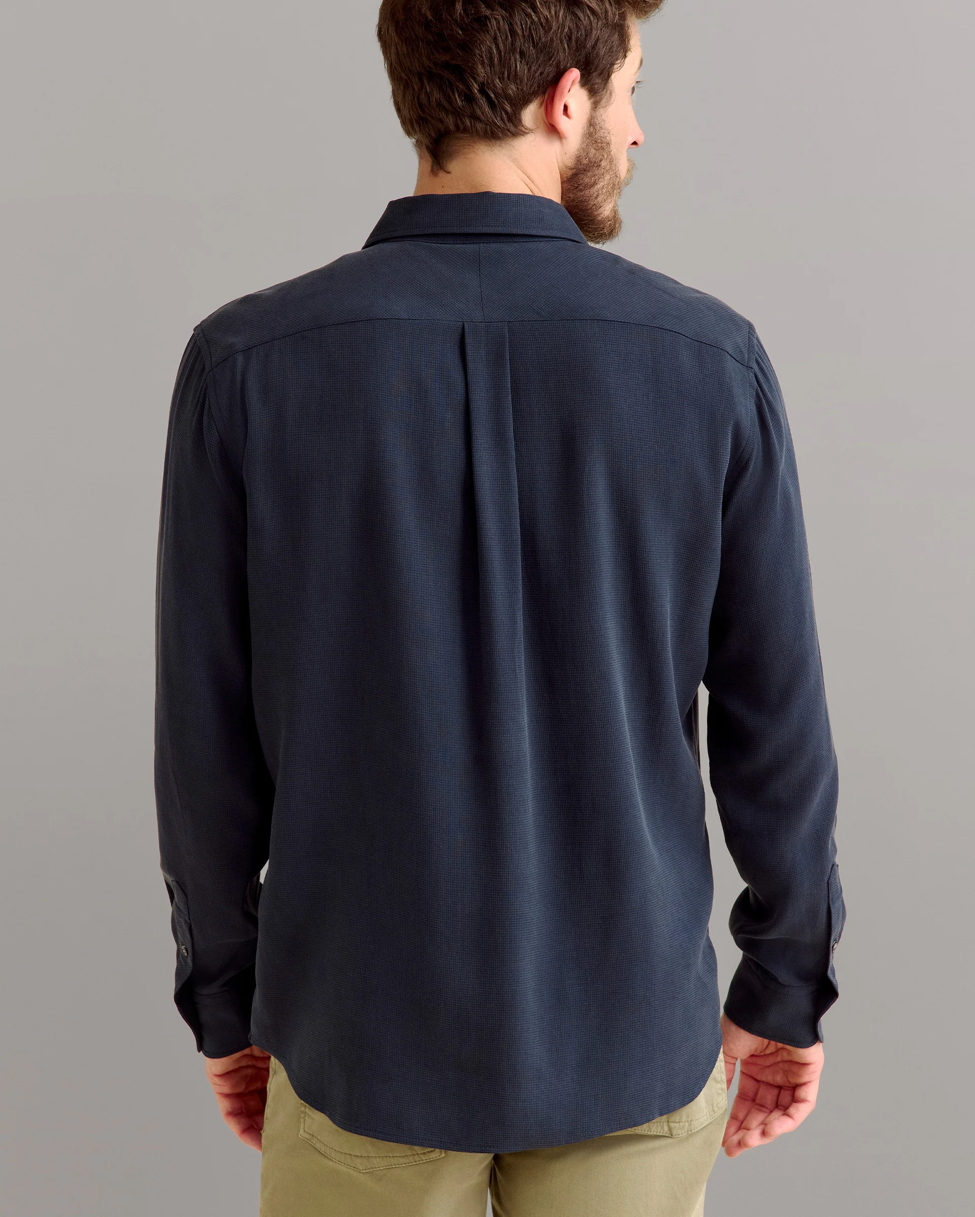 This staple style was named for a close friend of Billy’s. It’s made with a straight collar and our signature spade pocket and barrel cuffs. We wanted to create a version of the classic shirt with a luxury fabric like silk, in a solid color that’s based on one of Billy’s favorite shirts from years ago. Look closely and you’ll notice the micro waffle weave in the fabric that’s sure to feel extra soft and luxe every time you put it on.